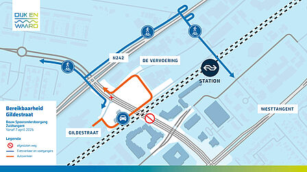 Vanaf dinsdag 7 april gaat het nieuwe viaduct bij de kruising Gildestraat–Zuidtangent open. Door deze nieuwe verbinding in gebruik te nemen, kunnen de laatste werkzaamheden aan de spooronderdoorgang worden afgerond. Hieronder leest u wat dit betekent voor uw route.